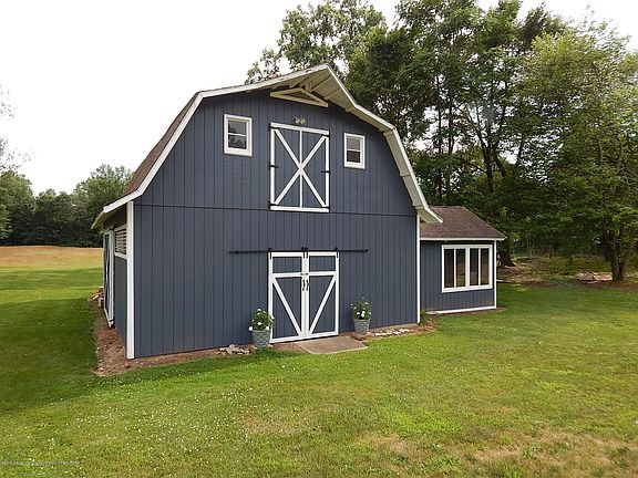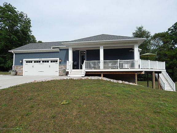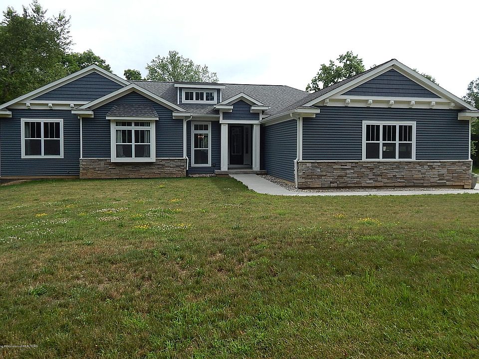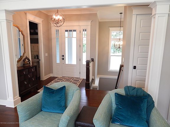 Oh my! Okemos. Must see to believe. Almost new custom-built Derengoski Construction ranch filled with yummy colors and special features through out! Truly out of a magazine home nestled in a country setting on approx. 4.110 acres of land with an out building. Beautiful foyer entry with direct views of the rear yard. 8 ft. doors. 9 ft. & 11 ft. ceiling heights and crown molding accents. Gleaming bamboo flooring. Amazing great room offering special porch paneling wood accents on the fireplace, built-ins, and floor to ceiling windows. Adjoining informal eating area with direct access door wall to the deck. Serving area with a beverage refrigerator and over the top stunning gourmet kitchen boasting gleaming quartz counter tops, stainless-steel appliances with a 5-burner gas range, subway back splash, walk-in pantry, and a generous eating bar. 1st floor laundry with a drop zone, bench, and porch access. Storage closet too!
