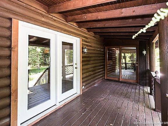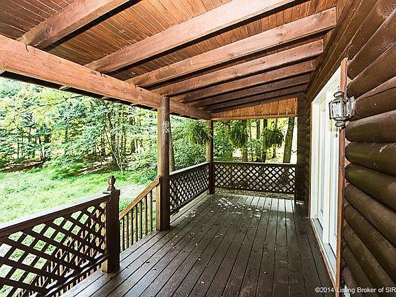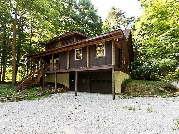 EXCELLENT LOCATION 15 MINUTES TO LOUISVILLE! Country living at its best with the feel of Gatlinburg on a Dead End Road. This beautiful, charming and spacious Log Cabin sits on 2.5 wooded acres. Many mature shade trees provide added privacy. A nature lovers dream!! So peaceful to sit back and enjoy your covered front and back porches with all the nature surrounding you. Open floor plan has large living area, dining and kitchen with gorgeous Pine Wood Floors and Cathedral Ceiling. First floor master has 2 closets, large master bath and door to covered porch. Second floor has another full bath, walk in closet and can be used as Master bedroom or Bedroom number 2. Partially finished walk out basement offers a 3rd bedroom with egress window. Unfinished area contains laundry hook up, furnace, hot water heater and access to 2 car attached garage which is insulated.