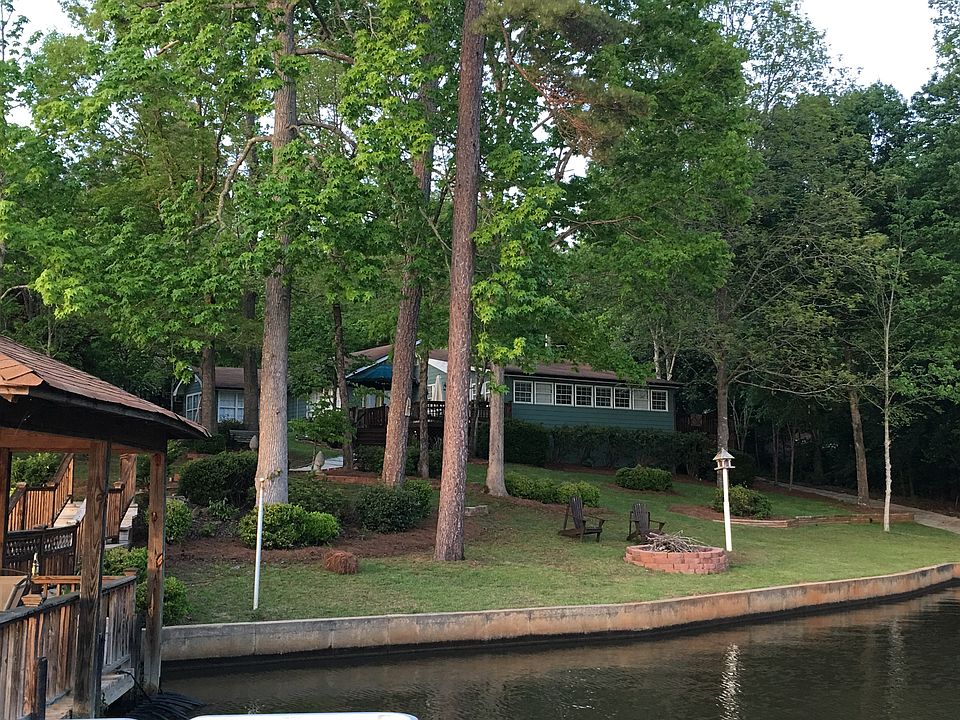 BACK ON MARKET! Down to the studs full renovation. Like a new home on a level wooded lot with poured seawall, boat ramp, covered dock, 2 decks, sodded lawn, nature trees and all you will need for a full or weekend lake home. Interior designed with lake life in mind. New floors, lighting, roof, driveways. All baths with new tile, lighting, bath fixtures...Rare full renovation. Inspected and repairs completed. 2 separate out buildings. One small for storage or bunkhouse/playhouse; one with 2 car garage and workshop; also upstairs partially finished for additional bedrooms etc... Located on the clear cool ALCOVY area. Please call for an appointment to see this unique lake getaway.