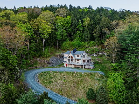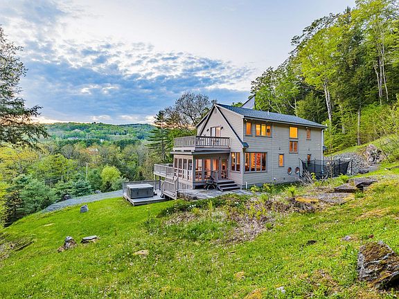 The hugely desirable and incredibly rare combination of wonderful westerly views across the local hills combined with a location minutes from the Quechee Clubhouse, this mountainside residence in Vermont’s favorite four-season destination resort community offers soaring cathedral ceilings and dramatic sun-filled spaces, modern construction and top of line finishes. The open concept Great Room includes a beautifully appointed eat-in kitchen with granite counters, stainless appliances, and a sunny east-facing breakfast nook. The kitchen opens onto expansive outdoor living and entertaining spaces including a screened in porch and multi-level wrap around deck that includes space for living and dining as well as a lower-level hot tub area. Ensuite bedrooms on two floors as well as top floor primary bedroom and guest suite, office/study, well-appointed baths, and a high level of fit and finish make this home a standout in the market. Modern systems, a large two car garage underneath and plenty of space for everyone, the mountainous character of the cliffs and stone faces that define the landscape at the Quechee Mountain House provide a dramatic backdrop for luxury four season resort living in the heart of Vermont.
