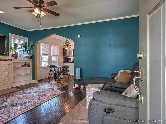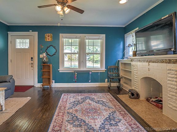 This lovely home is located in a quiet neighborhood just a short distance from the University of Tulsa campus. As you approach the house, you'll be greeted by a charming covered front porch perfect for relaxing on a lazy afternoon. Inside, the home boasts an open floor plan that's ideal for modern living. The living room features a cozy decorative fireplace and plenty of natural light, while the adjacent dining area has plenty of space for entertaining. The kitchen is a dream with all stainless appliances, ample counter space, and beautiful cabinetry that complements the Craftsman-style aesthetic. There's even a breakfast nook that overlooks the backyard, perfect for enjoying your morning coffee. The primary bedroom is spacious and inviting, with a large window that lets in plenty of natural light. The en-suite bathroom is beautifully appointed, with shower and updated vanity. The two additional bedrooms are equally charming, with plenty of closet space and natural light. But the real showstopper of this home is the amazing backyard oasis. With a lush green lawn, mature trees, and a stunning patio area, this backyard is the perfect place to entertain guests, host family barbecues, or simply relax with a good book. Overall, this Craftsman-style home is the perfect blend of style, comfort, and functionality, with a great location. Updates include: both sets of French doors, structural and converting knob and tube to breaker electrical service.