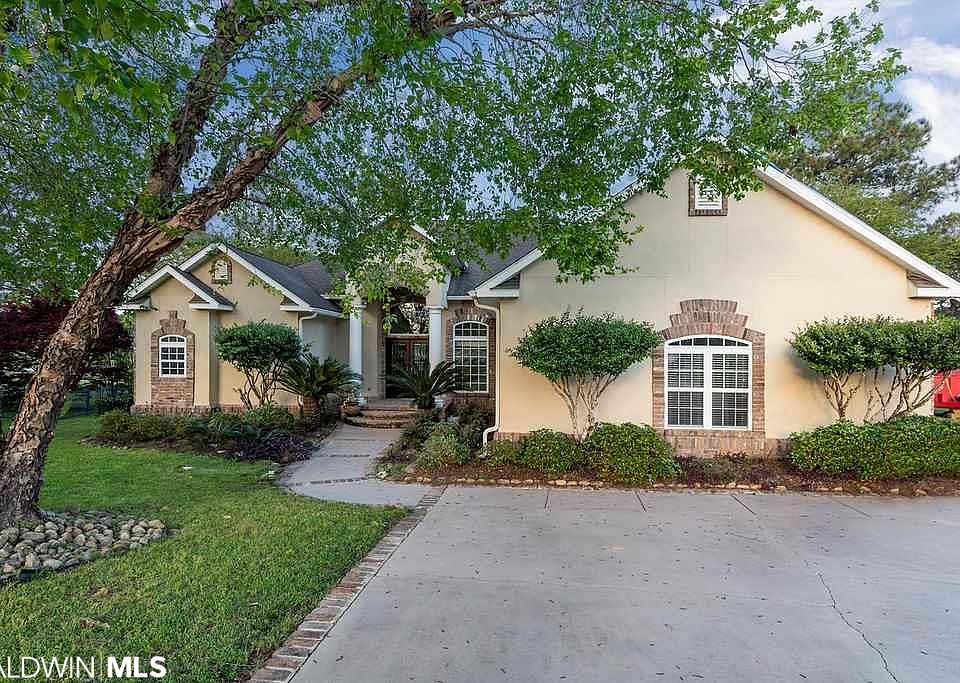Beautiful Golf Course home with gorgeous views of the LAKE in Fairhope Alabama! IMPRESSIVE CURB APPEAL AND you will love the serenity and surroundings of this ONE STORY custom built home on a LUSH cul-de-sac lot overlooking course and VIEWS OF THE LAKE. Built with RECLAIMED BRICK FROM MISSISSIPPI, custom built beveled glass front doors, MAHOGANY cabinets, HIGH CEILINGS WITH LOTS OF MOLDINGS, architectural details, archways, custom stained glass, and walk-in closets in each bedroom. There is even a cedar closet! Easy living floor plan with split bedrooms, casual family room open to kitchen, screened in porch, open covered porch and large deck. The master is a true SUITE with sitting area, doors to screened porch, and an elegant bath with vaulted ceilings, skylight, his/hers closets, and lots of storage. JUST COMPLETED in 2019: HARDWOOD FLOORS IN HALLS, MASTER BEDROOM, LIVING ROOM, AND DINING ROOM, CARPET IN BEDROOM 1 AND 2, BATHROOM TILE FLOORS, INTERIOR REPAINTED MARCH 2019 AND ROOF APRIL 2019. Sprinkler system, heated and cooled workshop w/sink phone and cable, irrigation well, tons of floored attic storage, 3 A/C zones, under deck storage, brick pathway, thousands in landscaping, gas grill hook up and more. Enjoy the views and wildlife from this serene setting. REAL STUCCO HOA is optional...