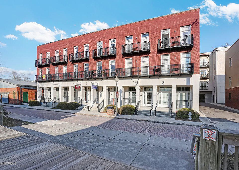 Downtown living is easy in this beautifully renovated condo. Located just steps from the Riverwalk, entertainment, shops, and restaurants. This 1bed/1bath has been meticulously redesigned with ample storage and barn doors for functionality and style. The fully equipped kitchen includes stainless steel appliances, new double ovens, tile back-splash, under cabinet lighting, water filtration system, and luxurious marble counter tops. Enjoy the spectacular sunsets over the Cape Fear River from the balcony overlooking this tranquil section of Water St. The extensive renovations include new HVAC system, water heater, redesigned kitchen & bathroom, and topped off with fresh paint all over. The building is gated and has an elevator. Schedule your showing today to see this move-in ready gem.