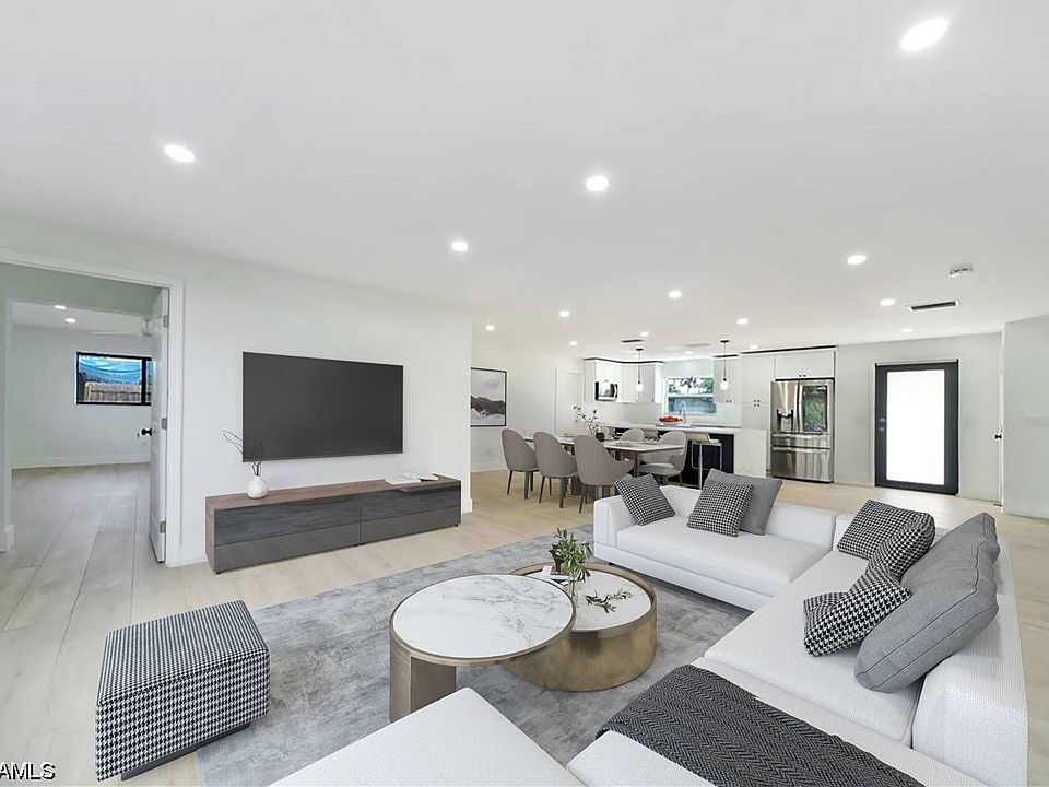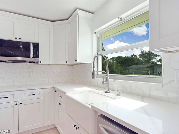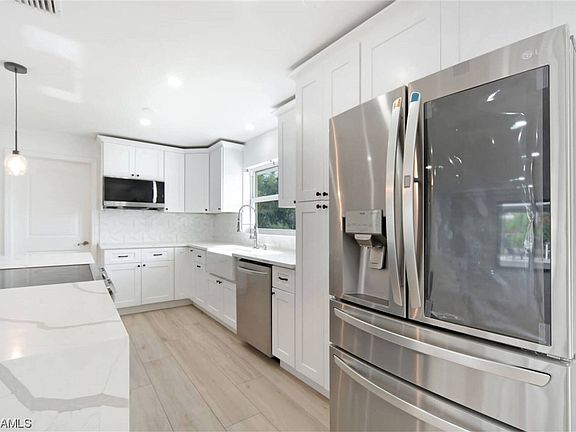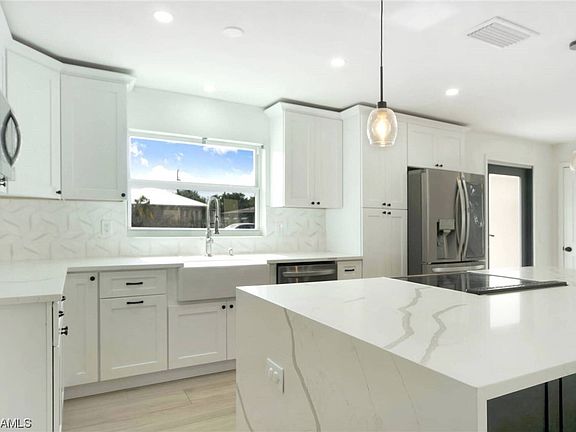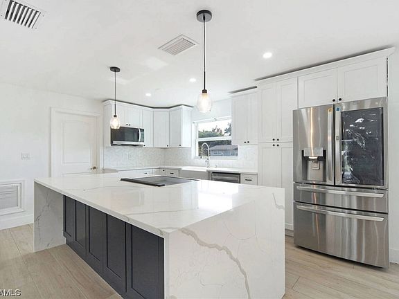 This completely renovated and spacious home features a modern open concept great room with newly installed impact resistant hurricane proof windows and doors, including beautiful glass sliders. The modern kitchen includes pendant accent lighting, soft close two tone cabinetry, an oversized feature island with quartz waterfall countertops, tile backsplash and new high end stainless steel LG appliances. Updated bathrooms with matching quartz counter tops and new cabinets. Main bathroom includes double sinks and a remodeled walk-in shower with new tile all the way to the ceiling. High quality extra wide ceramic plank flooring has been added to the entire home (no carpet). There is a new LG washer and LG dryer included. The large back yard includes a covered gazebo (shingle roof) and plenty of room to add a pool. The roof was replaced in 2023 and a new HVAC was installed. This property is close to downtown Cape Coral, just minutes from restaurants, shopping and the Cape Coral Yacht Club beach area.