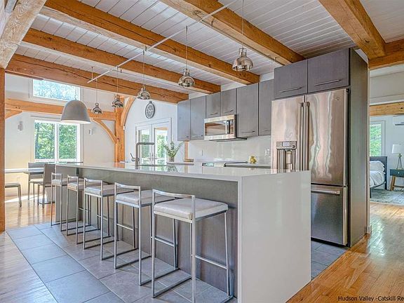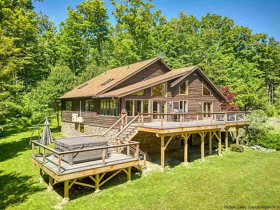 Custom built in 2000, this post and beam home is the perfect marriage of Upstate charm and a modern dream. Spanning over 4000 square feet spread out across three floors, the property includes four bedrooms (with a flexible fifth, three bathrooms, bonus living space and a home gym. It sits on 11+ acres of manicured grounds and surrounding forest that offer superb privacy. These are just a few of the amazing attributes of this home. Arriving at 215 Sheldon Dr., you are immediately taken by the charm of the property. The house has a handsome exterior with rich dark tones that blend perfectly into the surrounding landscape. Don't be deceived by the charming exterior - inside you'll be impressed by the grand scale of the home. First, enjoy the proper entryway with storage and room to leave behind the day's belongings. Passing through you will be drawn to the high ceilings, beautiful custom post and beam work throughout, and the stunning amount of natural light that floods in through sweeping windows. The kitchen was renovated by the current owners and is the focal point of the living quarters. Custom charcoal cabinetry is beautifully paired with contrasting white quartz countertops. The kitchen is outfitted with tremendous storage, ample counter space for prep work, stainless steel Bosch & GE Cafe appliances, and an island bar to entertain your guests. The kitchen overlooks the living room which is surrounded by oversized windows and glass doors that provide lush green views of the property. The setting ensures you feel tucked away in the woods, while bathing in natural light throughout the day. A commanding stone fireplace anchors the living room and creates a cozy place to join with loved ones on cool evenings. Opposite the kitchen/living is a proper dining space for those who love to host meals for a large group. The first floor includes a primary bedroom featuring an en suite bath. There are two additional bedrooms (one with its own loft, a second full bathroom and a separate laundry room/mudroom. The laundry room/mudroom features a slop sink, ample closet space, and a powder room. Moving upstairs you'll love the open loft space hovering above the living and dining areas. Currently arranged as a secondary living area, this loft can serve a multitude of functions. Keep it a second living area or create a home office - the options are endless. Off the loft is yet another bedroom, the fourth in the house. All of the bedrooms in the home comfortably fit queen or king sized beds. Passing down to the bottom floor, you'll find a large open living space outfitted with a secondary wet bar/kitchen. This floor has direct access to the yard, endless storage, and yet another bedroom, the fifth in the house. The lower level is currently used as additional living and entertainment space. It includes a full living room setup and a separate game area (including a pool table. This is a terrific space to gather and create memories with friends, or for extended family and kids to enjoy. Throughout, the house is heated with radiant underfloor heating and cooled with split AC units. Outside the house, you'll be impressed with the expansive exotic hardwood deck. The deck creates an extension of the living quarters and offers room for a formal dining area, grilling, as well as gardening. Place out your lounge chairs and take in the direct sunlight all summer long overlooking the lawn. In the evenings enjoy star-filled skies from the large hot tub that is perfectly situated on the deck. The grounds of the property offer substantial room for a pool in any of multiple locations depending on your preference. Finishing off this exceptional property is a completely fenced in sport court featuring a multi-use basketball/tennis/volleyball court, large fire pit, and additional play area. Electricity has been run out to this site for full nighttime usage. Located two hours from NYC and a short distance to other great local towns. Welcome Home