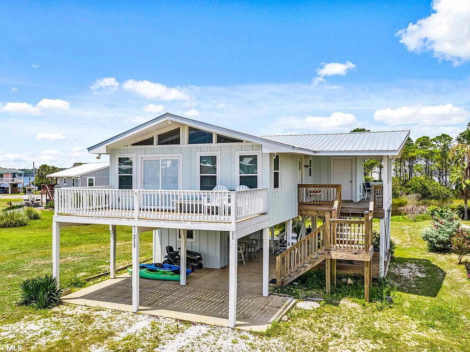 Beautifully remodeled waterfront home with expansive views! Perfectly situated on a large lot just steps to the beach, this home was completely updated in 2020/2021 and offers easy access to Little Lagoon. The home features a vaulted wood ceiling with exposed beams in the living area, a ship lap accent wall, solid panel interior doors, high-end window treatments, tile plank floors, Corian countertops in the kitchen, bar seating for two, smooth ceilings, a spacious balcony, outdoor shower, exterior storage closet, and a permit to build a 16' x 40' boat house. Recent renovations include a new metal roof, board and batten Hardie siding, new exterior stairs and balconies, freshly painted interior and exterior walls, new hot water heater, new flooring, and upgraded bathrooms. The home also boasts an air-conditioned ground level bonus room with a half bath. The property is conveniently located in close proximity to several dining and shopping attractions. Don't wait & the time to purchase this affordable waterfront home is now!