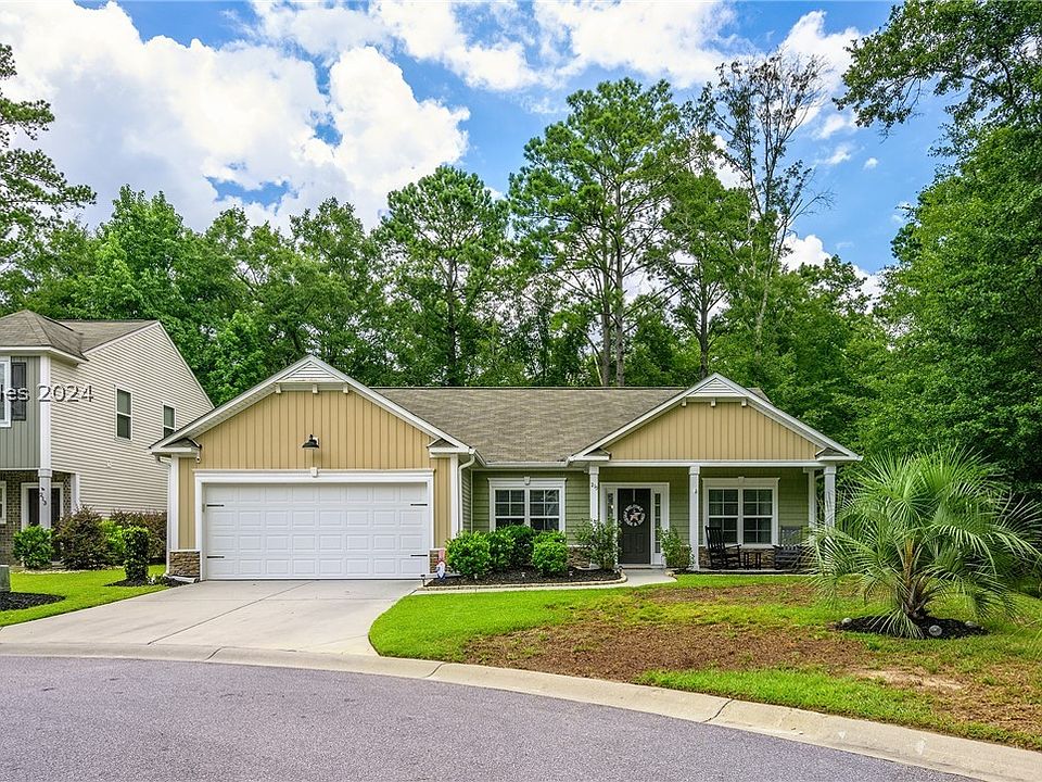 Southern Oaks presents - 3 bed., 2 bath home in a great location at the end of a cul-de-sac w/no home on one side. Upgrades incl. Granite Counters, SS appliances, 42" White Cabinets, LVP Flooring throughout, raised Primary and Guest Bathroom Vanities. Barn Door leads to the Primary Bathroom. Soaring Cathedral Ceilings in Primary /Great Room. Wainscoting Picture Boxes in Dining Area w/French Doors leading to an oversized Backyard Patio where you can enjoy outdoor gatherings overlooking the wooded views. Access to two community pools, close to New Riverside Village, New Barn Park, this home would make the perfect primary or investment property.