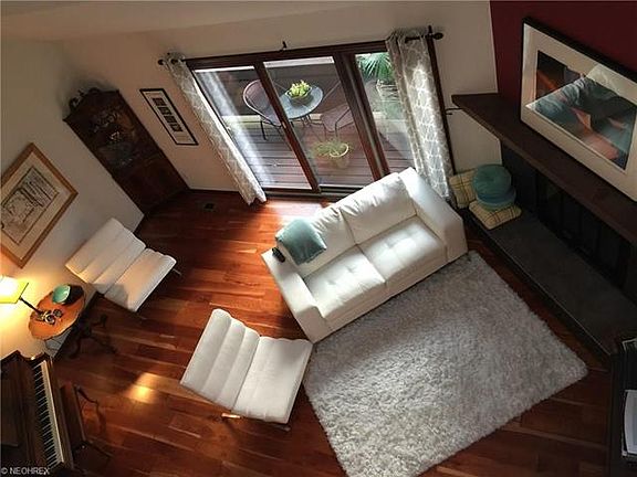 Beautiful light-filled "Open Concept" Townhouse. End Unit! Nestled into the hillside just minutes to Chagrin Falls Village. The vaulted ceiling Great Room has beautiful cherry floors and wood burning fireplace. The Master Bedroom has high ceilings, a large skylight and a walk-in closet. A huge privacy deck unique to the "end unit", with hillside gardens. The bright kitchen has newer appliances and a countertop breakfast bar. The Townhouse/Condo has a large Loft area/bedroom with French doors, terrace and a private full bath with ample storage. Newer furnace, Central Air and Hot Water Heater... Move-in ready! The Main Floor including; Kitchen, Great Room and Master Bedroom are up one level. Agent Owned.