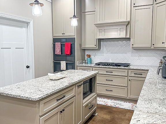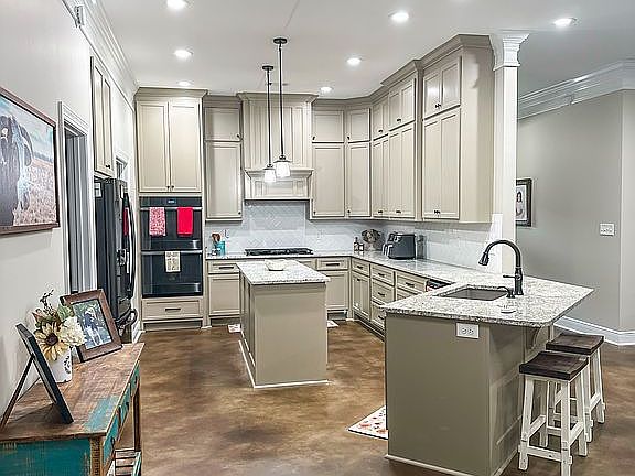 Step inside, and you'll be greeted by an open and inviting living space, complete with gleaming stained concrete floors and large windows that showcase the picturesque views of your expansive property. The heart of this home is the chef's kitchen, featuring granite countertops, stainless steel GE appliances, gas stove top, and ample cabinet space. A spacious walk in pantry with an attached hidden coffee bar inside. Adjacent is the dining area, perfect for family gatherings and entertaining guests.
