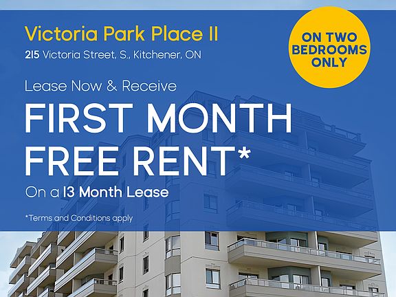Victoria Park Place II 1 & 2 Bedroom Apartments for Rent in KitchenerLooking for 1 or 2-bedroom apartments for rent in Kitchener? Welcome to Victoria Park Place II, a stunning rental community at 215 Victoria Street S. With an indoor saltwater pool, hot tub, sauna, fitness room, and social room, this building offers a luxurious lifestyle in a prime location.Live Near Kitchener's Best AttractionsVictoria Park Place is steps away from Victoria Park, Kitchener's oldest and most beautiful park, perfect for morning jogs or weekend strolls. You'll also love the vibrant Downtown Kitchener scene, featuring top restaurants, cafes, and shopping destinations (Explore Downtown Kitchener).Convenient Living at Victoria Park PlaceEasy transit access Steps to Kitchener GO Station and ION LRT for seamless commuting.Nearby shopping & dining Close to The Boardwalk and Fairview Park Mall (Shopping in Kitchener).Close to universities Quick access to University of Waterloo and Wilfrid Laurier University.Entertainment & culture Minutes from The Museum and Centre in the Square (See what's on).Find Your Perfect Apartment in KitchenerChoose from modern 1 and 2-bedroom apartments designed for comfort and convenience. Whether you're a young professional, couple, or downsizer, Victoria Park Place offers upscale living in the heart of Kitchener.Book a Tour Today! Contact us to find your new home at Victoria Park Place II, 215 Victoria Street S, Kitchener.Close to bus route: 20 Victoria-Frederick.Video surveillanceUnderground parkingVisitor parkingElevatorsOn-site staffStorage lockersWheelchair AccessAir conditionerFridgeStoveBalconiesCarpeted floorsIndividual thermostatsIn-suite storagePark viewsWalk-in closetsCable readyPublic transitShopping nearbyParks nearbyInternet readyEat-in kitchenRogers Cable and Bell satellite available through building cable systemIndoor saltwater pool, hot tub & saunaHydro paid to Wyse Meter SolutionsSecured EntryBarrier-free access to entranceDishwasherElectric Vehicle (EV) ChargingIn-suite washer & dryerPlease Note: Townhomes may have multiple models available at different starting prices. Apartment prices listed are the starting price for the suite style and may be more depending on the height and view of the actual available unit.