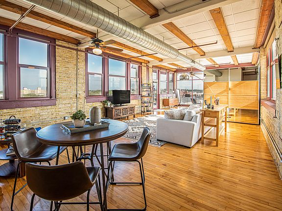 This place is so cool! Awesome views, great natural light, tons of private outdoor space, TWO parking spots, and an urban loft style you'll love. It's all here for you, perfectly situated between two hot neighborhoods - Walker's Point and Bay View. Easy access to everything you need and a beautiful space with flexibility to make it work for you: huge living area, room for a dining table, lots of options for your home office set-up, a stellar room divider/storage wall, and opportunity to easily expand the kitchen. In-unit laundry, storage unit, community fire pit, and new Butterfly lobby access complete the package. You won't find this kind of style with 2 parking spots for this price anywhere else!