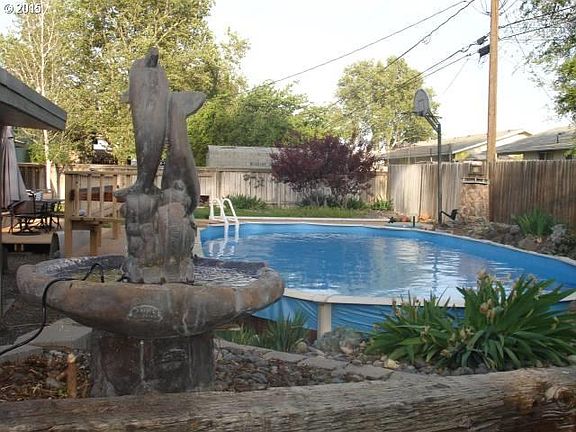 Great family home in a quiet neighborhood,close to Hermiston High School.This 3 bdrm 2 bath home has 1568 sq ft of space with a sun room for your sitting enjoyment. Kitchen,living room and dining room have African Walnut hard wood floors.Living room has a great pellet stove insert.Double doors from the Mstr bdrm go to a nice deck that leads to the above ground swimming pool with a nicely landscaped yard and a great dolphin fountain.