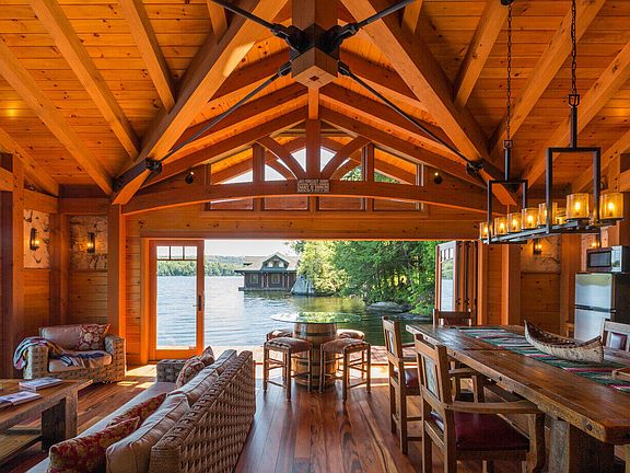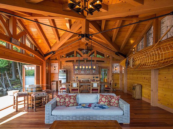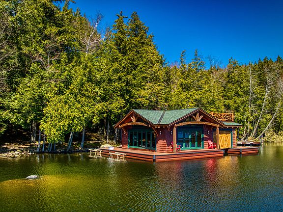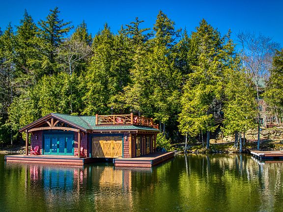 Nestled in the heart of the Adirondacks, discover an exquisite waterfront sanctuary on the pristine shores of Kiwassa Lake. This remarkable 2.9-acre property boasts a stunning Adirondack-style log home that seamlessly blends rustic elegance with its natural surroundings, from the ingenious foundation incorporating a massive moss-covered boulder to the thoughtful craftsmanship honoring the region's iconic style. Step inside to be transported to a world of authentic Adirondack ambiance, with five spacious bedrooms, 3.5 baths, and expansive windows framing breathtaking lake and mountain vistas. The interior finish work is of the finest craftsmanship including custom twig railings, rustic pine ceilings, native stone fireplaces and polished wood floors. Other features include an expansive great room, screened porch, hot tub and a massive outdoor deck. The centerpiece is the newly crafted boathouse, a masterwork of design creating an idyllic setting for lakeside entertaining and tranquil moments on the water. With direct access to over 32 miles of navigable waterways, endless adventures await, from boating excursions to exploring nearby islands, secluded campsites, and the charming village of Saranac Lake. This extraordinary property offers a truly unique and enchanting Adirondack experience, blending unparalleled privacy, breathtaking natural beauty, and a harmonious connection with the great outdoors.