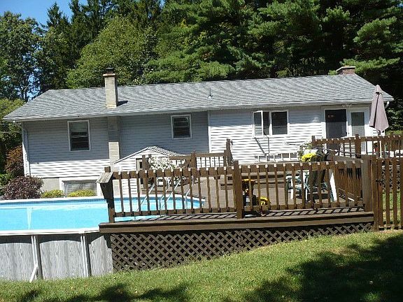 GREAT FAMILY HOME & BEST LOCATION IN GRANBY Across the Street from The Orchards Golf course. Professionally landscaped, single family home w/3 bedrooms, 1.5 baths, and huge, private deck w/heated swimming pool and brand new architectural roof. Main level has 1248 sq. ft. and lower level another 700 sq. ft of living space. Completely remodeled family kitchen w/ center island, lots of cabinets & tile floor, newly remodeled main bath, hardwood floors throughout, gas fireplace in living room and Vermont Castings wood burning stove downstairs. The finished, lower level has 1/2 bath,and 2 large finished rooms that could also be used as family room/office/ or 2 more bedrooms. This area has it's own private entrance. The home is directly across from the 13th hole of The Orchards Golf course w/ a Granby address. Lower taxes, great school system, country setting & an easy walk to Mount Holyoke College & The Village Commons. This home is connected to South Hadley sewer system - no septic system to worry about. Approximately 1/2 acre of land with a large, private, fenced in yard area, perfect for a family. This home has been lovingly cared for, is low-maintenance with vinyl siding and shutters, new architectural roof w/ 30 year warranty, 2-zone heating, newer doors & windows, professionally waterproofed basement. Walk across the street to the golf course with great walking trails and cross country skiing in the Winter. Spend summers around your own private pool completely surrounded by nature. A truly unique offering, this home is move-in ready, Buyers bring letter of PRE-QUALIFICATION from bank please! Neighborhood Description Fantastic location, with all the benefits of a terrific school system in Granby, country setting and the house is no longer dependent on a septic system. Home is connected to South Hadley sewers. Taxes are $2500.00 per year. Easy access to shopping, restaurants, highways, schools, and medical care. This home has been updated through the years and is a perfect home for a single, couple or family. The outdoor living area is completely private. New architectural roof with 30 year warranty. Basement has been waterproofed and the home is Move-In ready. Same owners for 36 years have given this home lots of TLC.
