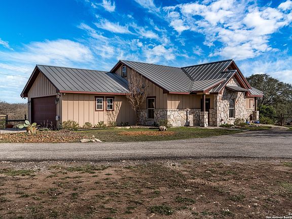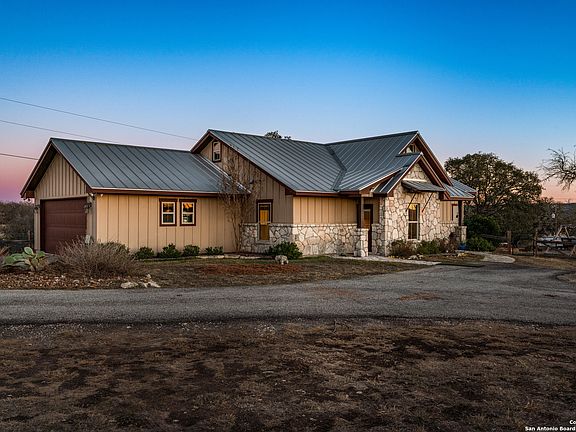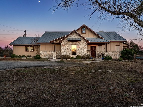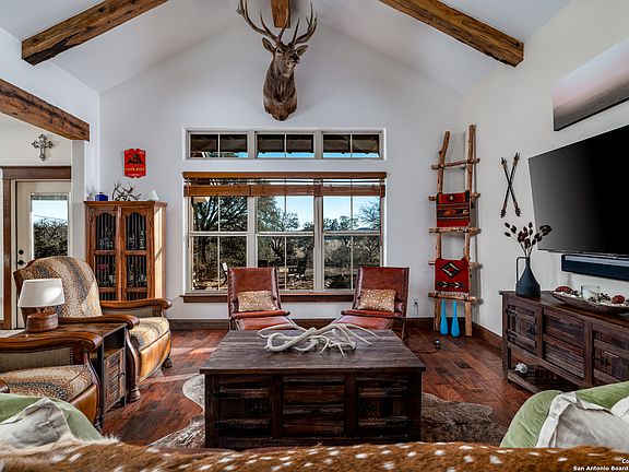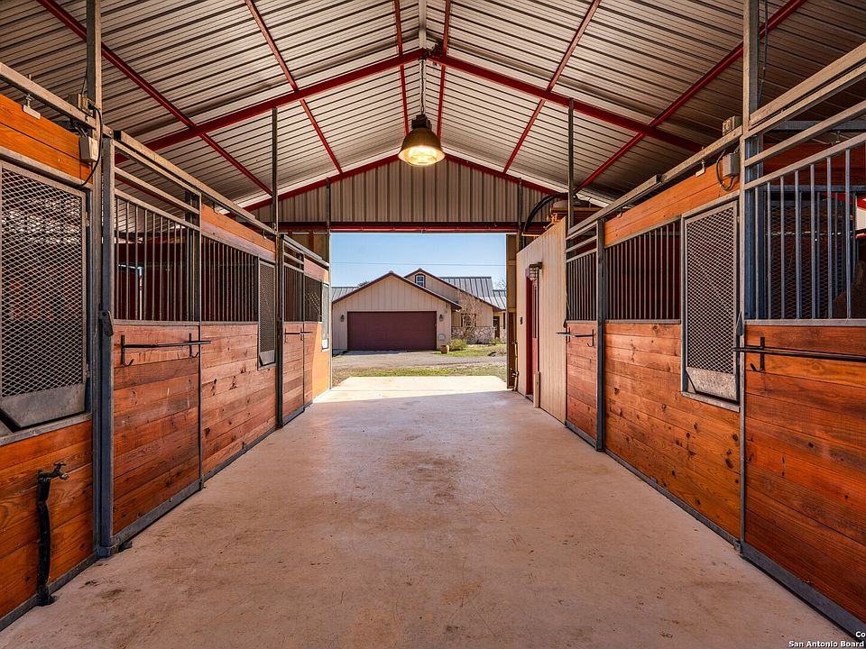 OPEN HOUSE SATURDAY MARCH 15th 2-4:30. 20 acre equestrian-lover's dream home in Comfort, TX. 1878 SF Hill Country Custom 1 story open concept home, with three spacious bedrooms with tray ceilings and wood beams, two great bathrooms, a well appointed kitchen with custom cabinets , large walk-in pantry, large utility room with a sink and an extra space for a second refrigerator, fantastic mud bench with coat closet catering to ranch-style living, an over-sized two car garage with windows, and great covered patio and an adjacent covered bar area overlooking the salt water pool, multiple sitting areas, and fire-pit. The special features include a tall steeple ceiling with natural wood beam ceiling accents, elegant wood trim work throughout, a combination of travertine and hand-scraped wood floors, custom cabinets throughout the kitchen with special features such as a cookie sheet divider, a pull-out garbage drawer, and full-extension drawer mechanisms. Both bathrooms and all closets are suited with custom cabinetry and drawers as well as pocket doors for added space. Enjoy a huge master bedroom closet with built-in shelving! Beautiful tile-work in both bathroom showers, with a double shower head in the primary bath, and tub-shower combo in the secondary bathroom, granite counter tops throughout, including the outdoor bar (equipped with a sink), and walls of windows to capture the scenery. In addition, this home's attic features ample space to add a loft, is equipped with decking for additional storage and has been pre-plumbed for an additional bathroom! Every angle of this cozy home artfully incorporates the beautiful outdoors. The functionality of the home includes the following details: spray foam insulation at roof deck and cellulose insulation throughout exterior and interior walls, a Central Vacuum System, pre-wiring for security, special lighting above and below cabinets, dimmers throughout, owned water softener system, Reverse Osmosis System, Sonos speaker system inside and out, 14 SEER HVAC system with media filter, garage and utility room both plumbed for washer & dryer! Amazingly well-set up for the horse enthusiast is a 36'X36' custom built horse barn with 5 12'X12' horse stalls, with solid tung & groove pine walls, and galvanized grills in between the stalls for great ventilation. Each stall is equipped with a pivot feeder and 8' tall sliding doors at the interior and exterior of each stall. Three stalls are equipped with their own pipe-fencing turn-out. The entire property is fenced and cross fenced for rotational grazing with field fence wire (no barb wire on any part of the premise). The back 11 acres and the 2 acre pastures to either side are planted with Coastal Bermuda, and there is a seasonal creek that runs through a portion of the property. The 12' center aisle is equipped with cross ties and an exterior wash rack with hot/cold hose bibs with a winter shut-off. Easy-access water and electricity to each stall. The tack room is insulated and equipped with a cooling & heating window unit, finished out walls, and a half bathroom. Warm up your horse in your expansive round pen and then take him out to your huge riding arena, freshly disked and ready to enjoy! Park your tractor, trailer and implements in their own work barn. Take advantage of your fully enclosed vegetable garden with raised beds, and a drip irrigation system.
