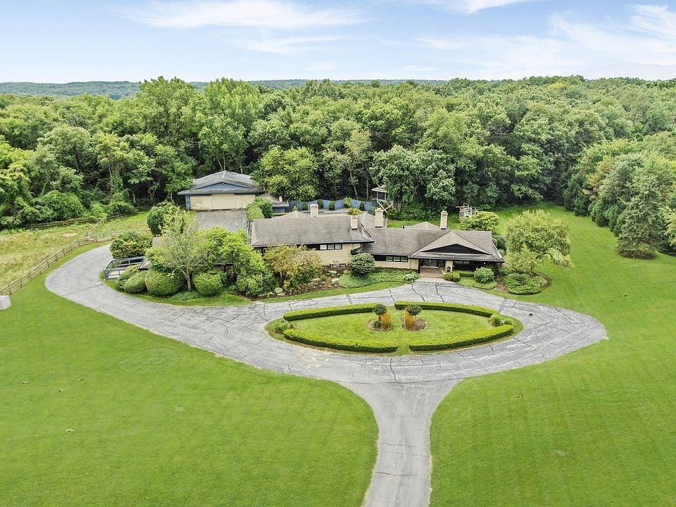 Secluded prairie style ranch built by C. Schwall, student of Frank Lloyd Wright. It features a pool, tennis court, horse barn/riding trails cross property. Area: Barrington Hills Village