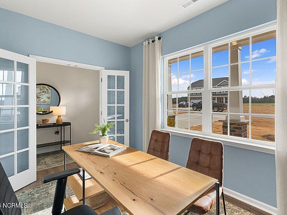Hoke Loop Ridge Subdivision The Wilmington plan is 2,824sqft. The Wilmington plan features 4 bedrooms, 2.5 baths, and a 2 car garage. It offers a living area, study, loft and an oversized kitchen with and island & breakfast bar that overlooks the great room. The kitchen features granite countertops, white ceramic tile backsplash, stainless steel appliances, gray cabinets, and a large pantry! The formal dining room allows a great space for enjoying company and entertaining guests. Durable RevWood Flooring is located throughout the main areas in the home that offer elegance and extreme durability. Upstairs you will find the primary bedroom plus 3 large bedrooms with walk-in closets and a loft! The primary bedroom is spacious with vaulted ceilings and an impressive walk in closet! The primary bath features dual sinks and a large shower!