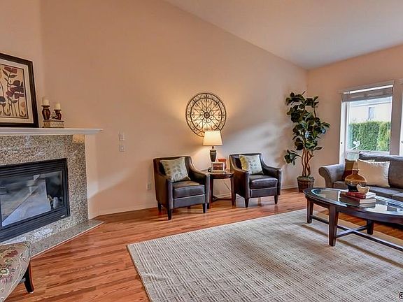Light-Filled Ranch with Mountain View This beautifully landscaped, 3-bedroom, 2-bath ranch has a view of Mt. Hood from the covered backyard patio. A spacious entryway leads to a large family room with a corner fireplace, ceiling fan and vaulted ceiling. The family room is open to the kitchen, which has stain-resistant quartz countertops, stainless appliances, an eat-in island and walk-in pantry as well as a dining area and doors leading to the fenced backyard. Gleaming Pergo laminate floors with the look of hardwood run through the family room, kitchen and entry hall. All three bedrooms have ceiling fans, including the master with its carpeted, walk-in closet and ensuite bath with tile-surround soaking tub, stall shower and dual vanities with quartz counters. The other two bedrooms have ample closet space and there is an additional full bath. Central air maintains a cool environment during the warmer months. Out back, the patio is surrounded by a privacy hedge which still allows the mountain view. Walkways roam between the impressive plantings and there is a water feature and a fire pit, as well as in-ground sprinklers. An attached, 2-car garage provides additional storage room.