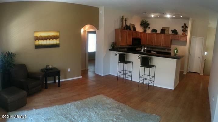 APPLICANT HAS BEEN APPROVED. Very sharp and nicely upgraded corner unit! 2+2+ one-car garage with living area all on one level with vaulted ceilings and BRAND NEW wood laminate flooring and paint! Spectacular open floorplan features upgraded kitchen with dark-granite counters, nice cabinetry w/brushed-nickel hardware, huge walk-in pantry, and intimate dining area across from kitchen! Spacious master bedroom and master bath with nice upgrades, huge walk-in closet, and separate exit to private terrace! Extra-large laundry room with full washer and dryer. TRE BELLAVIA features beautifully landscaped grounds with sparkling pool & spa! The community is close to 51-FWY, Loop 101, Harkins Theatres, Desert Ridge, and Tatum Corridor Shopping District!