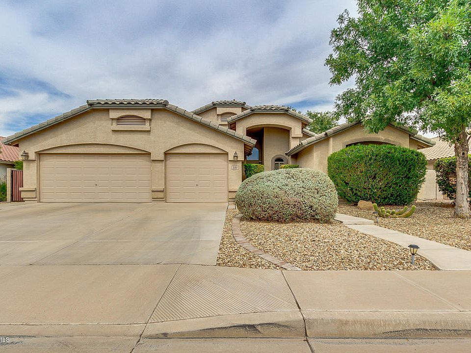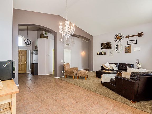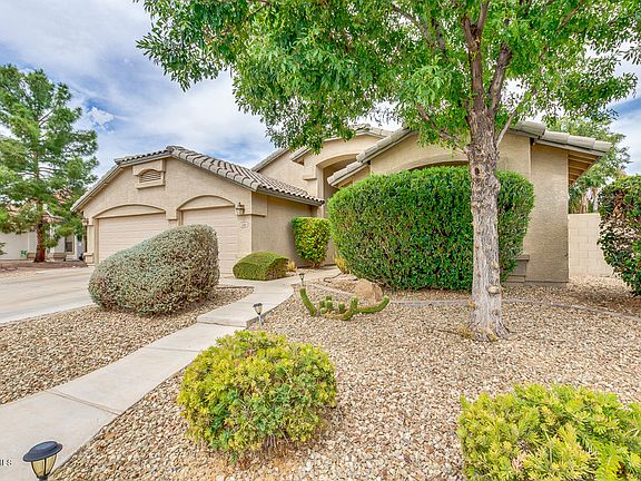 Enter the front door to be greeted by vaulted ceilings in a large, bright living room with big windows framing the views of the resort-style backyard. The kitchen sits just around the corner with a walk-in pantry, large island, quartz countertops, full tile backsplash and updated lighting fixtures. Kitchen opens to an amazing family room, for 2 distinct entertaining areas. Wonderful split floor plan with Master Suite on one side and two bedrooms, plus den/office on the other. Master suite has more vaulted ceilings, large windows and a door out to the back patio. Bath has dual sinks, updated vanity, large walk-in closet and beautiful stone tiled shower finish off the space. The living and family rooms have doors out to the large covered patio adjacent to the pool. 3-car garage & RV Gate Pebble sheen pool has easily removable safety netting. The backyard has mature trees, a small lawn area and then low-maintenance desert landscaping surrounding the pool, with plenty of decking for year-round enjoyment. The home offers ample storage from the walk-in kitchen pantry, the inside laundry room and large 3-car garage. The RV gate gives you access to more area on the side of the home. Beautiful laminate floors, tile and neutral carpet packaged with custom paint throughout give the home a designer feel.