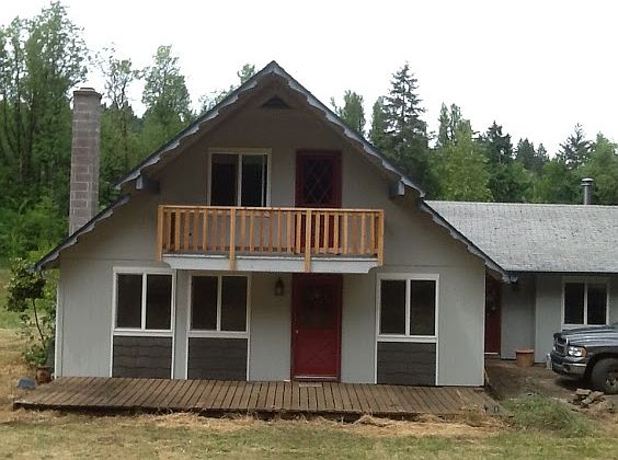 Lodge-style home on acreage. The house has a separate unit which can be used a "granny flat", mother-in-law apartment or rented to offset your loan. THE HOUSE: There are four (possibly five) bedrooms, including two large. ground level master bedrooms, three full baths, two full kitchens, laundry, abundant storage, and three living/family rooms with two new, certified wood stoves. 4.16 pastured and wooded acres. The property is in the forest zone so taxes are low. The out buildings include a large wood shop and animal barn and chicken house.