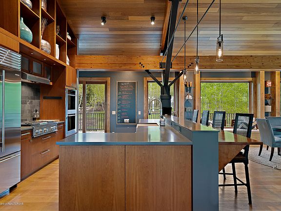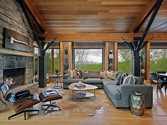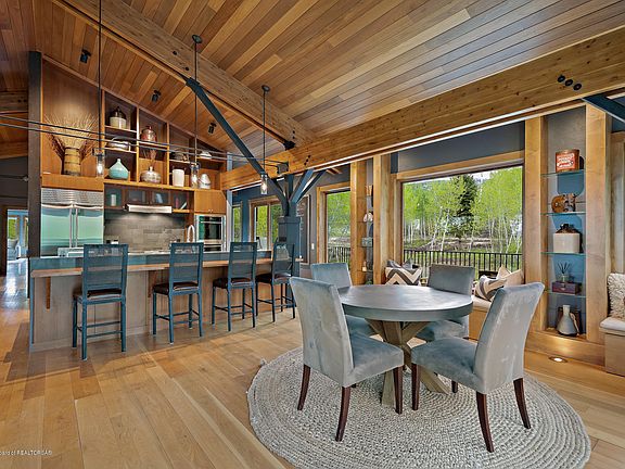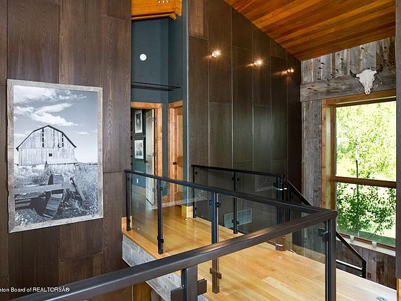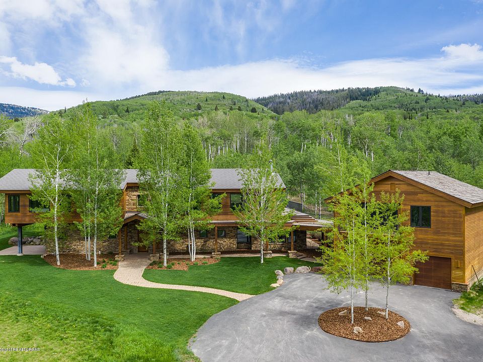 Tucked away on 35 pristine acres bordering National Forest in Alta, Wyoming is this spectacular Western contemporary style home of impeccable craftsmanship and design offering privacy, solitude and inspiring mountain views. Including the spacious guest quarters, the beautiful home offers 5 bedrooms with an elegant master suite, 6 baths, 2 kitchens, a wine room and top of the line appointments. The magnificent home was completely remodeled in 2008 with the addition of the guest home at that time. Every detail of the home was replaced or improved and the finest of materials were used to create this warm and inviting modern masterpiece that is being offered with elegant furnishings.The inside of this luxurious home features an open and spacious floor plan with a stone wood burning