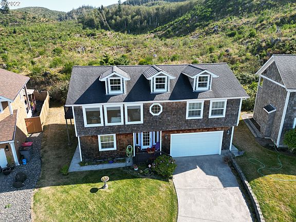 Presenting an exquisite 2003 custom-built residence, boasting breathtaking ocean views and nestled against pristine forest land. This elegant home is located outside the tsunami zone, offering safety and serenity. Designed with sophistication, it features hardwood flooring throughout the main living areas and plush carpeting in the bedrooms.The thoughtfully planned layout includes two luxurious master suites, each with direct access to the tranquil back deck and patio. Both master suites feature en-suite laundry rooms for added convenience. The expansive master walk-in closet seamlessly connects to the impressive wrap-around deck, providing a harmonious blend of indoor and outdoor living.The gourmet kitchen is equipped with a premium Jen-Air gas range, stainless steel appliances and sinks, and stunning granite countertops. The spacious, vaulted upper level showcases wood beams accentuated by ambient lighting, while the majestic river rock fireplace serves as a focal point in the living area. Modern glass handrails further enhance the home's contemporary design.An electric chairlift is available for increased accessibility, and can be left in place or removed upon request. The property also includes a convenient walk-in shower in the garage and a recently replaced water heater, ensuring optimal functionality and efficiency.Discover the beauty and sophistication of this remarkable home through the available drone footage and virtual tour. Don't miss this unique opportunity to experience coastal living at its finest.