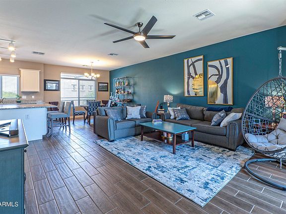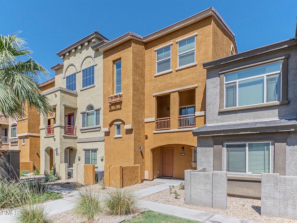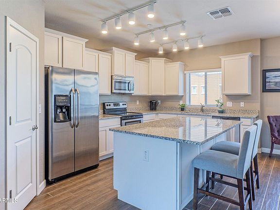 Beautiful pool side immaculate townhome nestled in the back of the complex. A private and quiet atmosphere, along with an open floor plan, neutral color palette, vaulted ceilings and wood tile luxury flooring throughout. The North/South orientation brings in natural light all day with no west facing windows or walls. Once inside, make your way to the eat-in kitchen featuring SS appliances. The kitchen has a large walk-in pantry, large island countertop for your guest to watch you cook and a dining area open to the great room. The primary bedroom with an ensuite bathroom, walk-in closet, and private access to the balcony through a sliding glass door. The other bedrooms, guest bath, and upstairs laundry round out this wonderful popular floor plan.