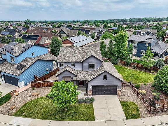 Nestled in the heart of the highly desirable Steel Ranch community, this meticulously maintained home offers timeless appeal and exceptional care throughout. A neutral color palette provides a versatile backdrop, allowing for endless design possibilities. Natural light fills the space, beautifully complemented by rich wood tones. Upon entry, you are greeted by a private office, featuring an elegant sliding glass barn door. The open-concept layout flows effortlessly into a cozy living room with a gas fireplace, creating an inviting ambiance perfect for both relaxation and entertaining. The adjacent dining area seamlessly connects to the spacious kitchen, which has an island with extended seating, abundant storage, and custom pull-out cabinetry for convenience. The main level is enhanced by refinished hardwood floors, adding warmth and elegance to the living spaces. Sliding doors open to a beautifully landscaped double lot, offering an ideal setting for outdoor dining and relaxation under a charming honeysuckle-covered pergola, ensuring enhanced privacy. Upstairs, the recarpeted bedrooms provide comfort and functionality. The expansive primary suite features a custom ceiling mural, and an ensuite bath, and a walk-in closet. Two additional upper-level bedrooms (one with amazing Longs Peak views), ensure ample space for family or guests or even a second office. The finished basement features a wet bar, a spacious family room, and a versatile area perfect for a home gym or game/playroom. A separate bedroom with a large closet and upgraded 3/4 bathroom provide flexibility and privacy for visitors or extended family. This home also offers an oversized 2.5-car garage adjacent to a convenient walk-in pantry off the mudroom. Located just steps away from Cowboy Park and providing easy access to an extensive trail system, this home offers an easy walk to local amenities, including the Street Faire, coffee shops, bars, restaurants, and charming downtown Louisville.
