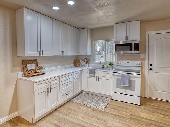 Charming 1-bedroom cottage with an office/possible 2nd bedroom on a fully fenced third of an acre lot that offers ample space for toys and guests in a peaceful neighborhood to enjoy the cool mountain climate and an area surrounded by national forests, rich with wildlife and outdoor activities. Features include vaulted ceilings in the living room, new flooring, appliances, and a mini-split unit.