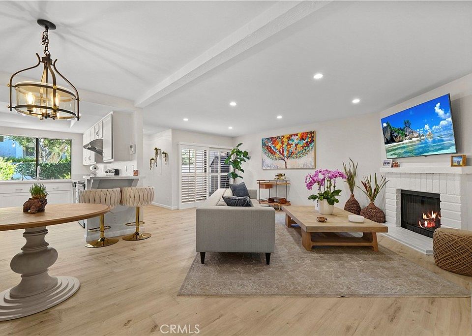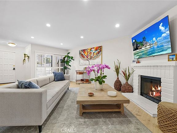 Welcome to Warner Club Villas, a beautifully maintained community in the heart of Woodland Hills. This spacious multi-level townhome blends thoughtful updates with warm, inviting charm. Enter through your private two-car garage on the lower level, then head upstairs to the main living area—a bright, open-concept space with wide-plank flooring, recessed lighting, plantation shutters, and a cozy white brick fireplace. The remodeled kitchen offers quartz countertops, shaker-style cabinetry, stainless steel appliances, and a garden window overlooking lush greenery.