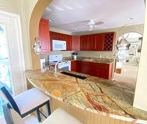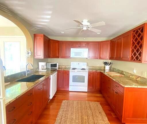 This former parsonage on Tilghman Island is a spacious and bright property featuring an eat-in kitchen with granite countertops, a breakfast bar, and ample cabinet space. The kitchen opens into a family room that overlooks the backyard and deck. The first floor includes an additional living area and a primary bedroom with an en-suite bathroom. Upstairs, there are two large bedrooms with vaulted ceilings, a smaller bedroom, and a generous hall bathroom. Located just minutes from St. Michaels, this home currently serves as a short-term vacation rental, making it a promising investment property or family home.