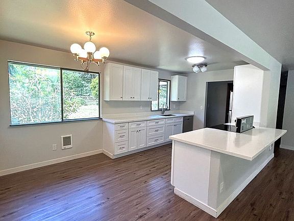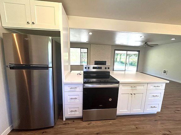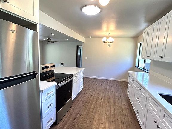 All new flooring and paint throughout the home. Kitchen has new cabinets and countertops, with large sink and small bar seating area. Kitchen appliances included. Living room is very large with ornamental fireplace and sliding glass door to back patio. Bathrooms are fully remolded with new vanities and tub surrounds. Spacious Primary bedroom with additional room attached perfect for a small kids room or office space, Laundry room with washer/dryer hook ups. Back features a covered patio and large partially fenced in yard. Barn is located on property for anyone interested in keeping a farm animal onsite. Pets negotiable, No Smoking Please drive by before calling to schedule a showing!! DO NOT APPLY TILL YOU HAVE PHYSICALLY SEEN THE INSIDE WITH AN AGENT!!