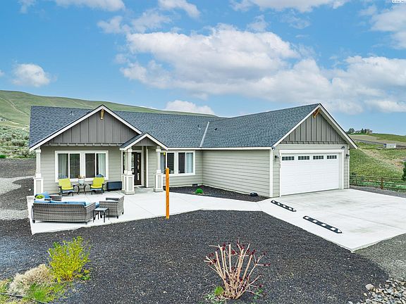 MLS# 283222 Nestled on 5.29 acres in the breathtaking Horse Heaven Hills overlooking Prosser, this beautiful one level home offers a tranquil escape. With its stunning views from every vantage point, imagine sipping morning coffee as hot air balloons float over the valley, or enjoying exceptional wines from local wineries while taking in majestic views of the amber sunsets framing Mt Adams and Mt Rainer! This 3 bed, two bath home offers open concept living, with a split bedroom floor plan, providing the Primary suite with spa like privacy, to include a tile shower, and walk in closet. There is also a door off the suite that leads to your large covered back patio! Let's not forget to mention, this grand property includes the hot tub, for even more relaxation! Back inside, your perfect kitchen boasts stainless steel appliances, quartz countertops, an apron sink, and kitchen island/breakfast bar! Let's talk Shop!! This newly built 24' x 30' shop is heated and cooled, and offers an easily accessible, huge loft storage space! Spacious rural living, yet just minutes from downtown Prosser, and quick access to the freeway to the Tri-Cities! Call your favorite agent for a tour today!