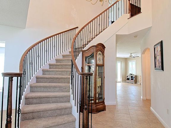 Beautiful move-in ready home with many upgrades. New carpeting upstairs. Gourmet kitchen with upgraded cabinetry, cook island, vegetable sink, walk-in pantry. Bedroom and full bath downstairs. Master bedroom is upstairs with large sitting area, 2 bathrooms with adjoining shower between, dressing area with built-in cabinetry, large walk-in closet with built-ins. 5th bedroom was converted to den off of master bedroom, can easily be converted back to 5th bedroom if desired. Save on electric bills with dual A/C system, tankless hot water system. This home is sturdy concrete block construction all the way up. Complete hurricane shutters. Home is situated on oversized corner lot. Covered patio. Auto sprinkler system that uses community water. Low HOA includes resort style clubhouse.