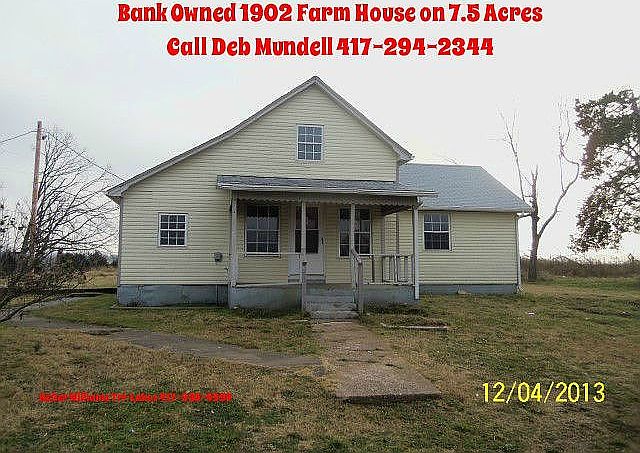 Call Deb Mundell, 417-294-2344, listing agent. Bank Owned Farm house on 7.56 acres. Burmingham road splits the acerage, see aerial attached. Home is on North side of road, large garage and a separate studio bldg (2 rooms and 1/2 bath) are on south side of road. This property is to be sold AS-IS and WHERE-IS. Neither the seller nor the listing broker make any representations or warranties as to the accuracy of this listing data sheet. Buyer(s) and Buyer's Agent to do their own due diligence. Buyer will have to have locks changed as no HUD key will be given out to the home.