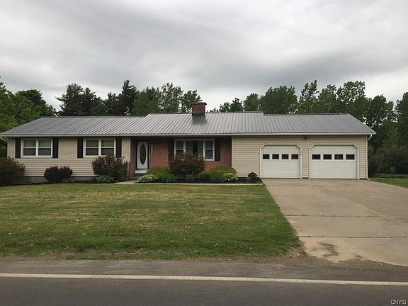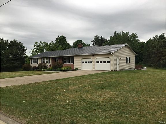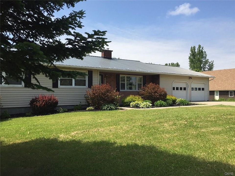 Great 3 bedroom ranch at village edge/ front has been professionally landscaped. Newer metal roof (5 yrs). Above ground pool with decking. Woodburning fireplace with insert. Both full baths redone with ceramic tile in past 5 years. Two acre lot offers lots of room with private back yard. Hardwood floors.