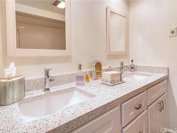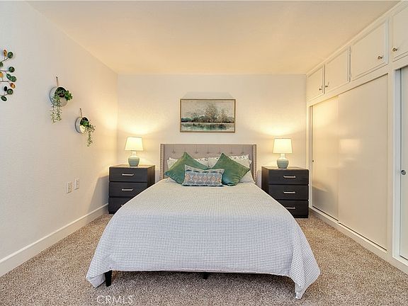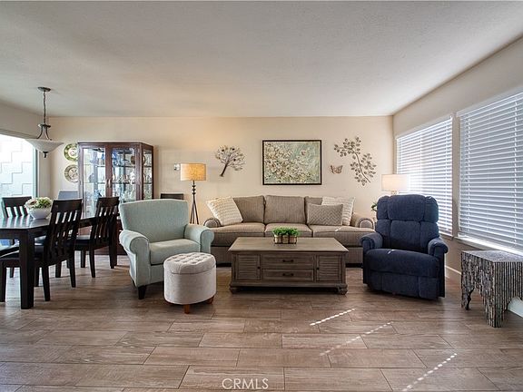 Lovely single story home for sale in the 55+ community of Laguna Woods. This remodeled Valencia 2 model, which is a single level unit with no one above or below you, features an open kitchen with granite countertops overlooking the spacious living room and dinning area. Low maintenance and ultra durable wood patterned tile flooring covers the living room, kitchen, bathroom, and hallway. The bathroom has a newly installed double vanity with soft closing drawers and a quartz top. There is both a bathtub with shower as well as a walk-in shower. The two bedrooms feature newly installed carpeting and ample closet space. Stacked washer and dryer can be found in the hallway closet. This home has two outdoor spaces - a cozy atrium and a spacious patio featuring an electronically retractable awning which lets you easily add shade to the patio when needed and then retracts out of the way to let natural light into the kitchen and bedroom! The community itself is guard gated and features a wide assortment of amenities including, but not limited to, 2 golf courses, multiple clubhouses and fitness centers, swimming pool and spa, tennis and pickleball courts, lawn bowling and bocce ball, dog park, and free transportation service.