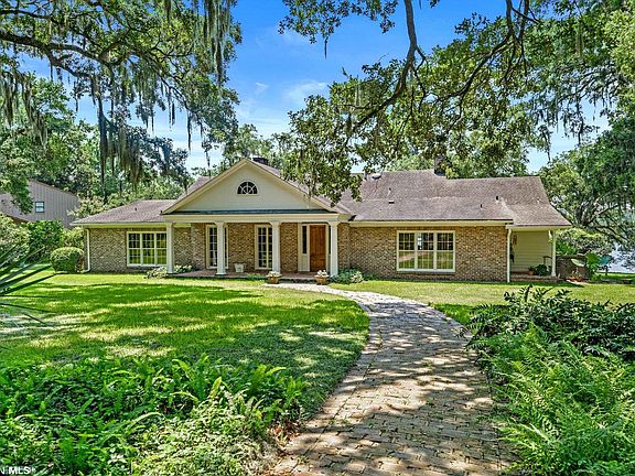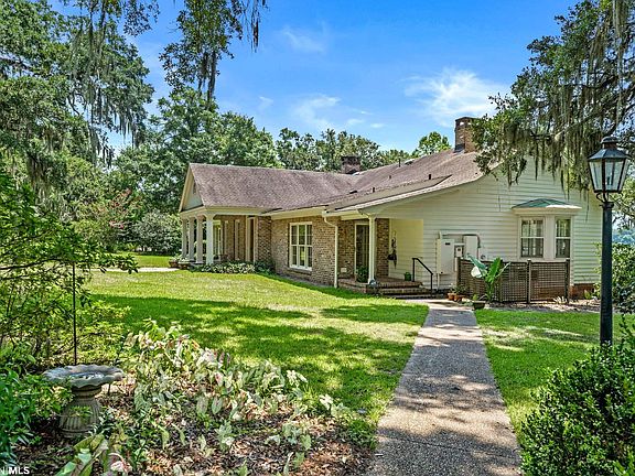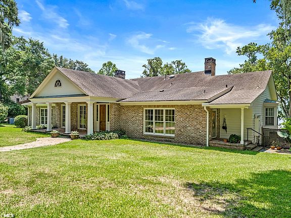 A one-of-a-kind property on the wide, deep part of Dog River with unobstructed views of the river. The property has 4 structures on approximately 7 acres, with 230 feet on the river: the home, the garage, the cottage, and the original pump house. There is also a boat shed, a wharf with seating, and a small kayak wharf. The house was designed by architect G. Ross Hammond and built in 1948. The house has a front porch, foyer, gallery, dining room, library with a fireplace, 3 Bedrooms, 2.5 Baths, breakfast/bar kitchen, a large glassed-in porch on the river, an attic with pull down stair access, quarter-sawn red oak hardwood floors, old brick floors in the gallery and pine floors on porch. The exterior is Old Mobile brick. The cottage adds an additional bedroom and bathroom, and is currently set up as a studio. The detached 2 car garage has 2 heated and cooled offices and a walk-up attic. Lavish mature landscape includes gorgeous oaks, old camellias, and a scuppernong orchard.