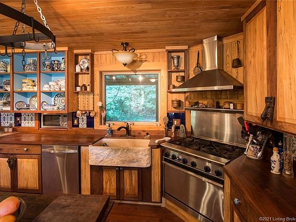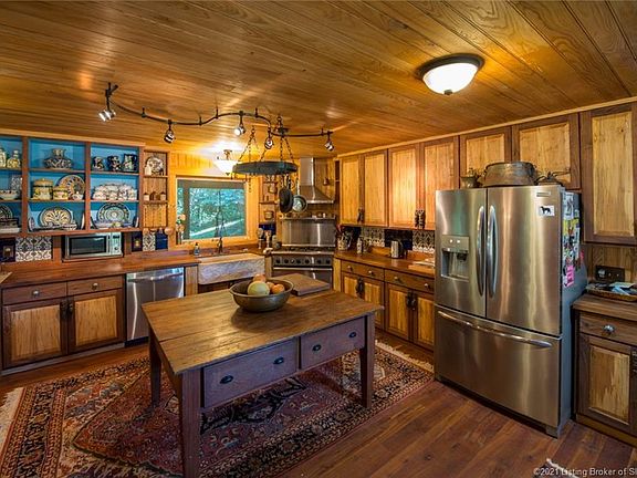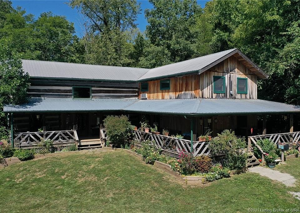 This unique cabin, built with hand hewn oak and poplar old-growth logs, sits above Indian-Kentuck Creek on 39.16 acres minutes from historic Madison, Indiana. Custom built from a "dog trot" log cabin and a stick-built frame addition, this home has all modern amenities and antique charm. With large open rooms and a kitchen built for entertaining, this 4280'sq. house can serve as a home, retreat, vacation home or secluded remote work/school office. Nature lovers, birders, and hunters will enjoy watching wild life from 1400 square feet of covered porch. Famous for white tailed Deer, SE Indiana has wild turkey, eagles, river otters, beavers, bobcats, coyotes and many hawks and owls. The grounds of this property include a horse barn with a workshop and an outdoor wood-stove heated sauna and garden shed. The house sits on a Thickly wooded hill looking overlooking 6.7 tillable acres in hay, a half-acre original orchard yard and is bordered by Indian-Kentuck Creek. Enjoy quiet seclusion at this farm just 11 miles from historic Ohio river town, Madison Indiana just an hour from Louisville, Kentucky to the southwest and Cincinnati, Ohio to the northeast. One of the largest cities in Indiana in the late 1800's when the Ohio river was the primary mode of travel to the west, Madison has more recently been named an Indiana "Stellar Community". A unique feature in downtown Madison is a National Historic Landmark district.