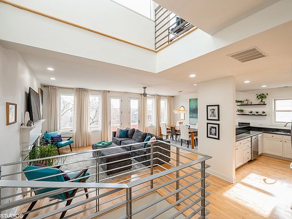 3 bed 3 bath DUPLEX PENTHOUSE with TWO PRIMARY SUITES and two living areas in top rated Mayer School District. The main floor has Kitchen, Dining Room, Living Room, 2 bedrooms, and 2 bathrooms. Upstairs is a Family Room (perfect for home office) with wet bar and another Primary Suite. GREAT OUTDOOR SPACE! On the main floor a 25 foot terrace off the Living Room has SKYLINE VIEWS. Upstairs off the Family Room is a rooftop deck with more SKYLINE VIEWS. THIS IS NOT A FOURTH FLOOR UNIT. You enter on the second floor which takes you up a private staircase to your third floor unit with interior staircase to the second floor. (See floor plans) PRIME LOCATION half a block from Oscar Mayer and Webster. Roof deck replaced and recent projects completed. (see attached) Garage parking.
