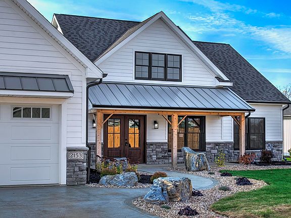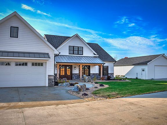 Welcome to this stunning, farmhouse-inspired home located on 1.6 acres. This custom-built masterpiece offers an unparalleled combination of style, luxury, and functionality. With a meticulously landscaped yard, this home is designed for both comfort and entertaining. As you approach the home, you'll be captivated by the accent metal roofing, elegant wainscot stone, and durable Hardie siding on the front exterior. The oversized garage and double front entry doors create a grand entrance, while the covered front porch plus the additional back patio—offer perfect spots to enjoy outdoor living and the stunning views. Step inside and discover a grand floor-to-vaulted-ceiling stone fireplace (gas) in the living area, complemented by custom built-ins this a perfect place for a cozy night in. The gorgeous premium custom trim work throughout the home adds an extra layer of sophistication, while recessed can lighting illuminates the space beautifully. The open-concept great room/flex space and entertainment room flows seamlessly from the kitchen, making it ideal for hosting gatherings, game nights, or enjoying quiet time with loved ones. The heart of the home is the extra-large kitchen, which boasts a wealth of custom cabinetry, including over and under-cabinet lighting, a deep farmhouse sink, and a drawer-style microwave. The kitchen also features stunning quartz countertops and a beautiful tile backsplash that enhances the space. A huge pantry off the kitchen provides ample storage. If you prefer cooking with gas, a gas line is available for a gas range. The home offers custom closets throughout, an oversized laundry room and custom cubbies in the mudroom area off the garage to keep everything neat and accessible. Additional highlights include a well-lit, insulated 3 car garage with a premium epoxy-coated floor, an additional 40x30 pole barn, and a high-efficiency furnace and A/C, making this home as energy-efficient as it is luxurious. Located near shopping, parks, walking trails, and entertainment, this home is ideal for families seeking both exceptional quality and location. Seller concession/allowance is available for the buyer to use as they see fit! Don't miss out!