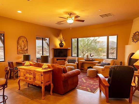 Southwest style custom home with 3 bedrooms and 2 baths located on 2.27 acres. Nicely laid out open floorplan offers easy entertaining and allows spaces for family living as well as separated sleeping areas for privacy for guests and visiting family. Kitchen with island bar and stainless steel appliances, pine cabinetry, and butlers pantry. Stained concrete floors complement southwest colors throughout this home. Front courtyard area and back covered patio to enjoy the views. Home has two air conditioning systems as well as an evaporative cooler. Custom tile and a jetted tub in master bath add to the relaxed ambiance felt throughout this lovely home. Desert views during the day and breathtaking views of the night sky make this a home you would be proud to share with your family and friends.
