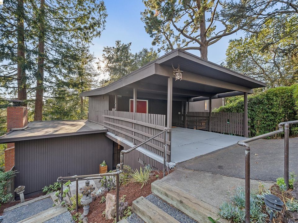 Welcome to your serene retreat at 2153 Magellan Drive, nestled in the heart of Oakland. This charming Mid-Century Modern home offers a warm and inviting atmosphere, with light-filled spaces and wooded vistas from every window. Spanning 2255 square feet, this residence features three spacious bedrooms and two and a half beautifully appointed bathrooms. The heart of the home is the expansive great room, seamlessly combining the living and dining area. The kitchen is directly adjacent —perfect for both everyday living and entertaining. Step outside onto the large deck, an ideal spot for hosting gatherings or simply enjoying the tranquil surroundings. Upstairs you will find a full bath and two bedrooms and an additional living area, with kitchen and au-pair or in-law potential. The home has three decks, a sitting room, and all sorts of creative potential. The primary suite is a true sanctuary, offering ample space and comfort. Upstairs, a versatile rumpus room opens to another deck, providing additional space for relaxation or recreation. With a generous lot size of 10,350 square feet, this property offers plenty of outdoor space, including a two-car carport and additional off-street parking. Embrace the spa-like ambiance and make this beautiful retreat your own.