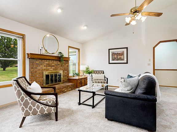 Enjoy the beautiful views from this light-infused and spacious single level home in Meridian's desirable Cherry Lane Village. Poised on a large, premium lot overlooking the golf course, this home boasts a raised hearth brick fireplace, new carpet, a great room, living room, primary suite (with patio access, walk-in closet), and an over-sized two car garage with workbench and shelving. Welcome HOME...