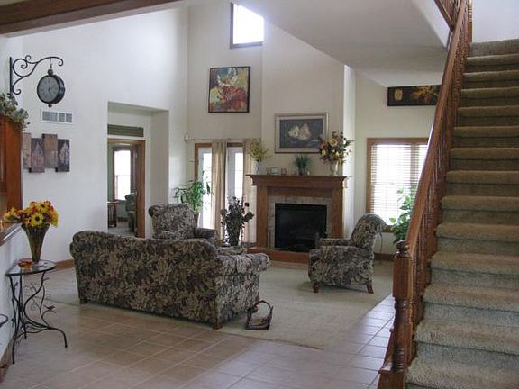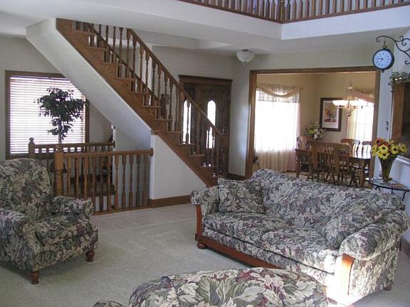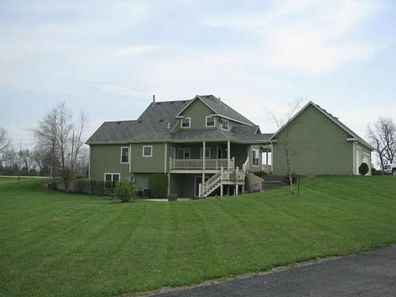 Nice Country setting for this 1 1/2 story Traditional Home on 9.5 acres. Home features 4 BR, 3 1/2 BA, full walkout basement, open floor plan, 6 panel solid hardwood doors, kitchen island, gas fireplace, laundry hook-ups off kitchen & basement, large family room in basement with custom made bar, alarm system, zoned CA/heat, deck off kitchen and patio off basement, wrap-around porch, whole house humidifier & air purifier, 3 car detached garage with over head storage, storage building with office space & RV hook-ups.