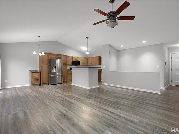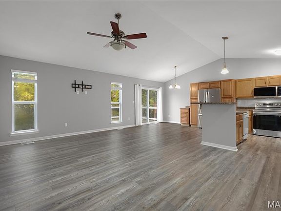 You'll be impressed by this 3-bedroom, 3-bath ranch in the Windsor School District. The living room is bright and open with vaulted ceilings creating an inviting space to relax or entertain. The kitchen is well-appointed, boasting plenty of cabinet space, a dedicated dining area, and easy patio access. Vinyl flooring flows throughout the main level, combining style and ease of maintenance. The primary suite includes a walk-in closet and private bath. The finished lower level features a full bath with walk-in shower, two egress windows, and a walk-out. Outside, you'll enjoy a fenced backyard with privacy backing to trees and a spacious 2-car garage with extra bay room. The roof is less than a year old. This home balances comfort, functionality, and a natural setting in a strong school district.
