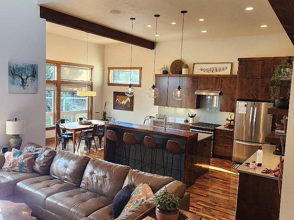 Contemporary Single Level Ranch style home sitting on 3.26 acres in SE Bend. Just minutes to downtown, shopping, and all amenities. 4 Bedrooms, Designated office, Bonus Room, 2 full bathrooms, great room concept. Custom Built in 2015. Large green house, garden, chicken coop, hot tub, shed/outbuilding. Primary bathrooms floors are heated for comfort in winter. Beautiful stack stone fireplace. Simply Safe Security system, Under counter lighting, Wired for surround sound, wine refrigerator.