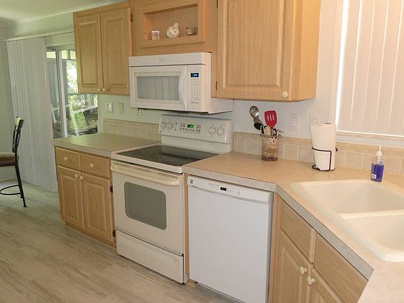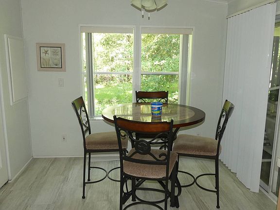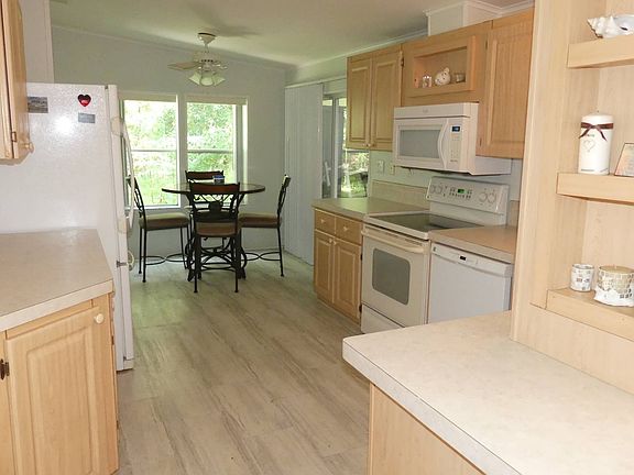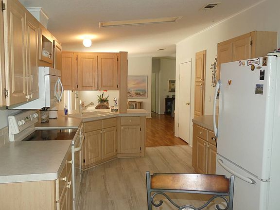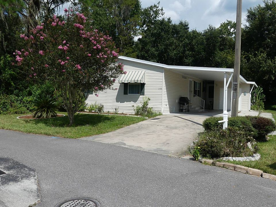 2000 Palm Harbor situated on a spacious wooded lot. This split floor plan home is a 2 Bedroom with a Den and features 1452 Square Feet of living space. The master bath has a nice size walk in lighted closet with double sink vanity and walk in shower, with another closet in the master bedroom. The den is located off the living room. The kitchen has plenty of cabinet and counter space with a breakfast nook and pantry. There is laminate throughout except in the bedrooms and they are carpeted. Other nice features of this home are: marble window sills, tape and textured walls, Air conditioned lanai with windows, ceiling fans, French door refrigerator, guest bath tub/shower, dining area and vertical blinds throughout. Sold turnkey with a golf cart. Contact Cypress Lakes Sales & Information for more information and showing requests.