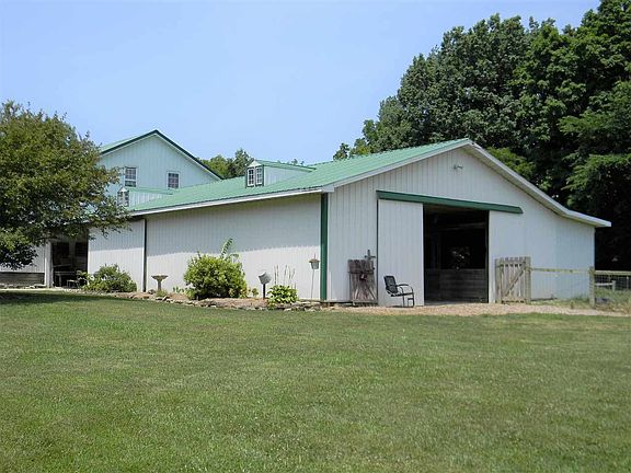 Custom built pole building home on 10 acres. Open concept living space offers tall ceilings, wide planked hardwood flooring and hand hewn beams. The kitchen is a charmer with the antique looking stove, upper antique cabinets, wood counter top and sink that has been in the family for generations. Large dining area and cozy living room with wood burning stove. Master bedroom suite is one of two bedrooms on main level (currently being used as a den), large laundry room and mudroom. 2 nice size bedrooms upstairs and reading nook. Covered front porch across the entire front adds plenty of outdoor living space. Attached 48x48 barn with stalls, potting shed and nice gathering space.25x37 building with workshop and wood stove, 29x49 drive through barn and fencing for livestock. Sitting back in a private setting the property was published in Mercantile Gatherings and this magazine worthy home is looking for a new owner